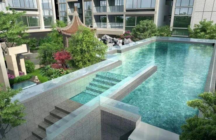 社区内部配套围绕“全龄友好”展开,泛会所概念贯穿多个架空层。儿童活动区铺设软质地面并设置遮阳棚,老人健身角配有适老化器械,中间穿插休憩座椅与绿植组团。最令人眼前一亮的是板块内少见的空中花园双层悬浮泳池——上层为成人恒温泳道,下层结合水景打造亲子戏水区,四周被垂直绿化包裹,私密性与景观性兼顾。园林由山水比德操刀,以“六廊八景三居游”为脉络,移步换景间融入青砖、灰塑、竹影等元素,虽绿化率仅11%,但通过立体绿化和庭院式布局提升了实际体验。