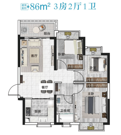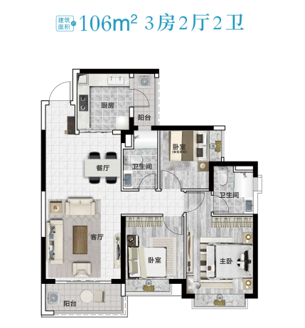 大三房、双阳台设计,生活阳台用来容纳洗衣机等生活用具,景观阳台则提升生活品质,观景实用皆拉满,居住品质感直线上升。