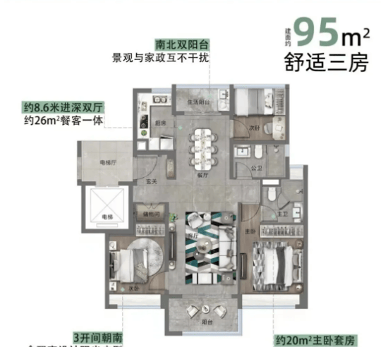 小高层户型包括95㎡三房与125㎡四房,采用1梯2户或2梯2户设计,专梯入户提升私密性与尊贵感。95㎡三房户型使用率高达87%,空间布局合理,动静分区明确,客厅连接阳台,采光通风效果极佳;主卧配备独立卫生间与衣帽间,保障居住舒适度;两个次卧空间充足,可根据需求改造为儿童房、书房等,适配三口之家的居住需求。125㎡四房户型则更加宽敞,南北通透,客厅与餐厅相连,拓展活动空间,适合多孩家庭或三代同堂居住,每个房间都能保证充足的采光与空间,居住体验极佳。