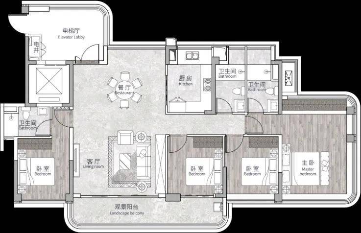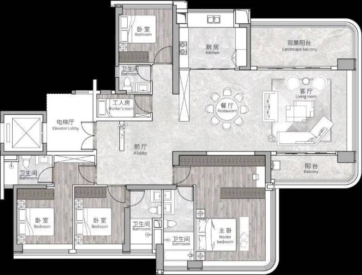 全套房设计:主卧、次卧、老人房、保姆房均带独立卫浴。