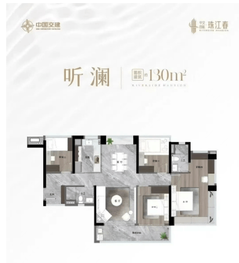 130㎡三房两厅两卫:全南向设计,3 梯 4 户配置,实测套内面积约 143㎡,客厅连接 7.2 米宽景阳台,望江面宽达 15 米,通过 LDK 一体化设计拓展公共活动空间,主卧配备步入式衣帽间,兼顾实用性与景观性。
