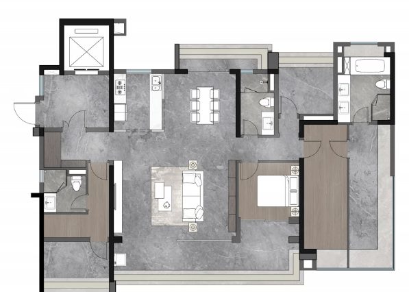 建面约143㎡:全景舱平层设计,配备奢阔通厅及中西双厨配置。