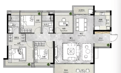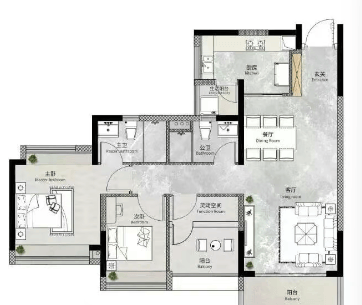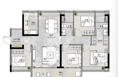 133㎡四房两卫:三开间朝南,南北双阳台,客厅开间达5.8米,主卧约25㎡,交付包含中央空调,高舒适度设计。
