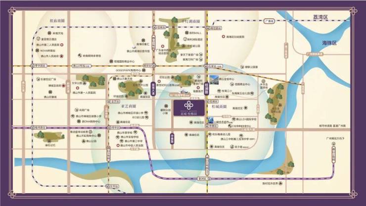 项目坐拥密集路网:南海大道、岭南大道、三龙湾大道等城市干道环伺,自驾出行高效便捷;距地铁4号线(在建)石肯站直线约500米,未来可快速接驳广佛核心区;约30分钟车程覆盖佛山西站、佛山机场、广州南站三大交通枢纽,轻松融入大湾区1小时生活圈。