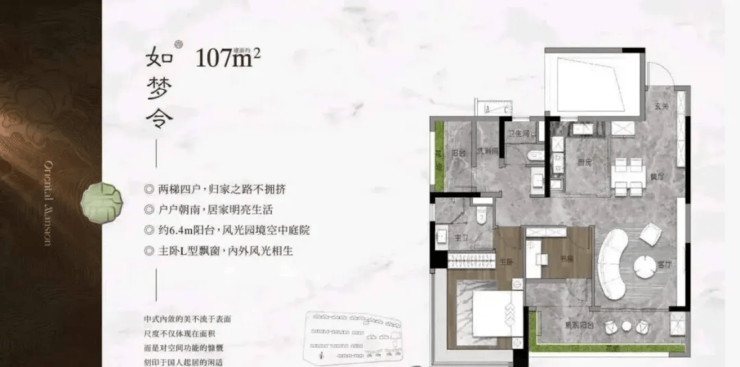 建面约107㎡三房两卫是刚需友好型户型,采用三开间朝南设计,采光充足。户型布局合理,空间利用率高,主卧带独立衣帽间和卫生间,保证了主人的私密性。两梯四户的配置,能够满足日常出行需求,避免了高峰期等待电梯的困扰。