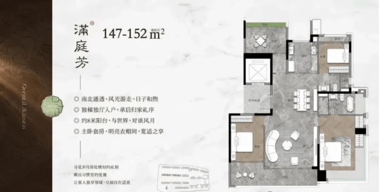 建面约268㎡改善大平层是项目的旗舰户型,采用三梯两户配置,其中包含独立保姆电梯,尊崇感十足。户型配备LDKG大方厅,面积近120㎡,空间开阔大气,适合举办家庭聚会或商务宴请。主卧带270°全景飘窗和双台盆卫浴,采光和视野极佳,居住质感拉满,是高端改善家庭的理想之选。
