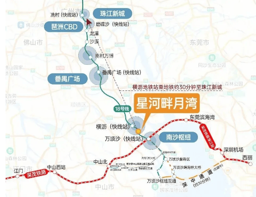 项目地处明珠湾区万顷沙板块,位于国际金融岛与南沙枢纽 TOD 双核心交汇,交通优势显著:地铁方面,接驳 18 号线横沥站(首批交楼后开通免费业主楼巴),该线路时速 160km/h,3 站直达珠江新城冼村站,未来南延至中山、珠海;枢纽方面,距南沙枢纽站(在建,规划 14 站 30 线轨道)约 5 公里,深江高铁接入后可快速通达大湾区;自驾方面,门前灵新大道为南沙主轴,衔接深中通道广州出入口,1 小时可达深圳、中山,轻松融入 “大湾区 1 小时生活圈”。