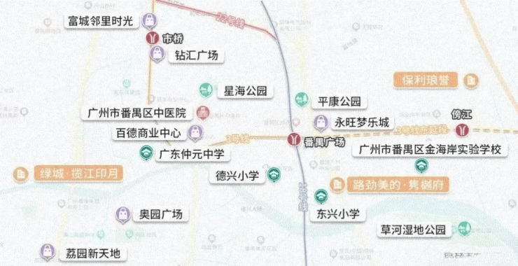 具体来说,项目周边的交通网络十分发达。虽然距离市桥地铁站有一定的距离,但这并不意味着出行不便。相反,项目周边1公里范围内竟然汇聚了10个公交站,形成了一个密集的公交网络。这意味着,无论是去往市桥中心区,还是前往其他区域,居民都可以轻松选择公共交通出行。对于有车的家庭来说,自驾出行的便利性更是无可挑剔。项目紧邻禺山西路,这是一条贯穿番禺南北的主干道,通过这条路,可以迅速接驳东新高速和番禺大道。向东可以快速到达广州南站,向西则可以直达佛山顺德,向北则是通往天河、海珠等中心城区的快速通道。这种四通八达的交通格局,极大地拓展了居民的出行半径,让“双城生活”成为可能。