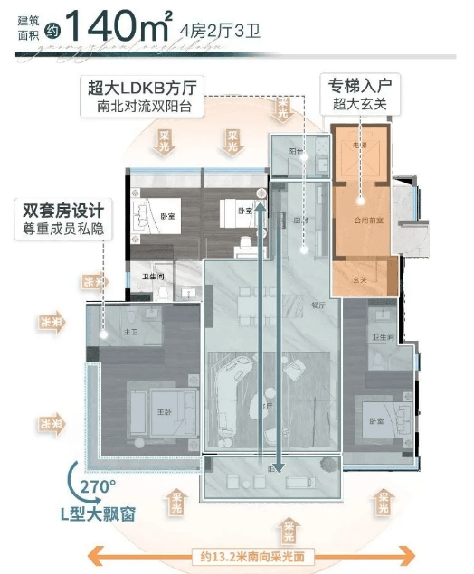 1. 【林隐】建面约140㎡:罕见一梯一户板式大平层,双主套设计,全明卫,南北双阳台,空间通透,采光充足,布局合理,既能满足三口之家的居住需求,也能兼顾长辈居住,私密性与舒适度兼具,适合追求便捷、舒适居住体验的改善家庭。