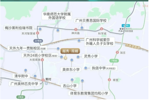 3. 广州天河外国语教育集团持续扩张,不断引入优质教育资源,提升区域教育品质,近期多个新建楼盘确认与天外教育集团合作办学,进一步丰富了天河区的优质教育资源,也推动了周边学区房的价值提升,越秀观樾自带天外合作小学,核心竞争力进一步凸显。