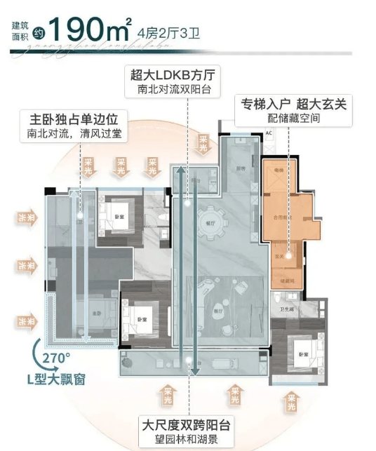 2. 【山趣】建面约190㎡:约17米南向面宽,全屋超高窗地比,全南向功能房,主套约270度IMAX级环幕视野,可直观山景与园景,空间宽敞奢阔,LDKG一体化设计,社交与居住空间分离,适合人口较多的高端改善家庭,兼顾居住舒适度与社交需求。