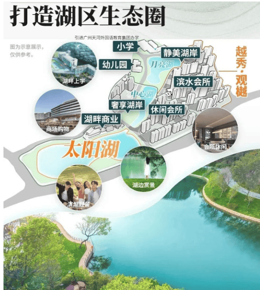 1. 双湖环绕:项目直面占地约5.3万平的月亮湖和太阳湖,经过越秀地产的全面治理与生态修复,湖水实现生态自循环,水质优良,湖岸线足足达约1.9公里,观樾的每一期地块,都以「环湖向阳」为布局准则,直面水域面积约3.3万㎡太阳湖,让湖居从“少数人的特权”,变成了社区里触手可及的生活底色。