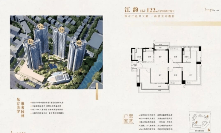 一百二十二平方米的四房户型,在空间布局上更为舒展大气。超七米的南向大阳台,是该户型的一大杀手锏,不仅提供了广阔的观景平台,还可作为家庭的第二客厅,用于健身、养花、品茶等休闲活动。LDK一体化设计(客厅、餐厅、厨房),打破了传统空间的界限,让家庭成员的活动空间更加充足,互动更加频繁。部分户型可直瞰江景,将自然风光引入室内,提升了居住的格调与品质。总价在三百七十万至三百九十万元之间,适合追求更高居住舒适度的改善家庭。这款户型在细节处理上也十分到位,收纳空间充足,动线流畅,充分考虑了人体工程学与生活习惯,让居住变得更加轻松惬意。