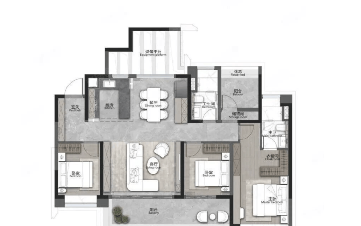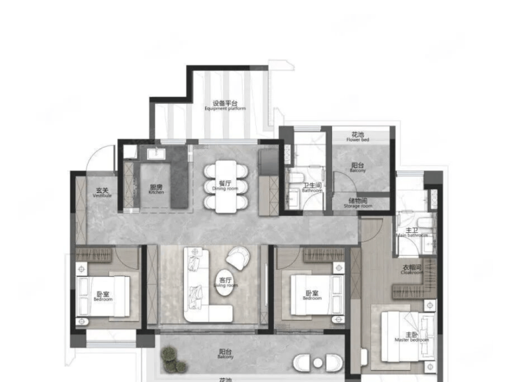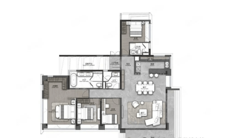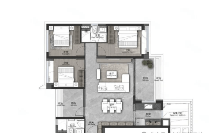 131-143㎡户型:顶级改善户型,四房两厅三卫,LDKG一体化设计,拥有超大景观阳台。