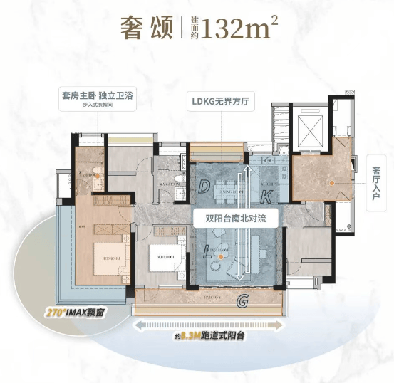 建面约132㎡:跑道式景观阳台,LDKG大方厅,社交餐厨空间。