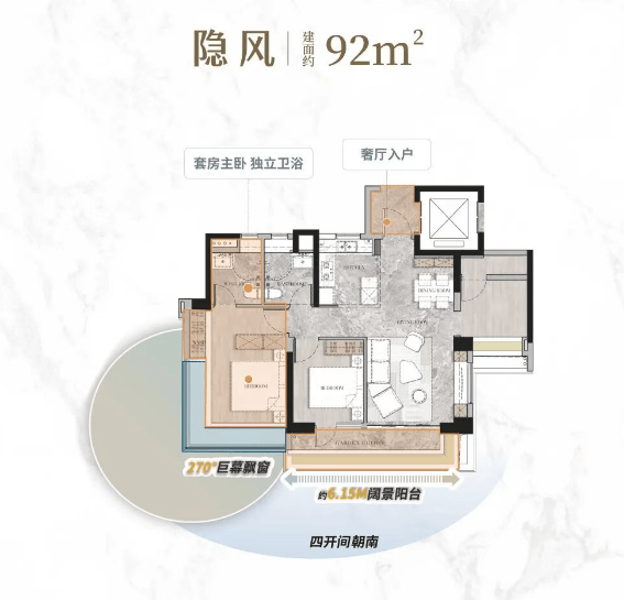 建面约92㎡:四开间朝南,配备6.15米阔景阳台,主卧设有270°巨幕飘窗。