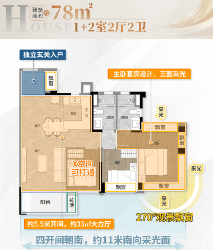 78㎡三房两厅两卫升级感明显,四开间朝南,超 11 米南向采光面,让每个房间都能享受充足阳光;270 度采光设计,直望园景,视野开阔;主卧空间宽敞,能轻松放下 1.8 米大床,还配有独立卫生间,保障私密性;两个次卧可以作为儿童房或书房,满足三口之家的成长需求,总价约 170-180 万,性价比极高。