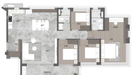 建面约160㎡四空间两厅两卫:五开间朝南,一体化巨幕客厅,南北双阳台,南向双套房设计。