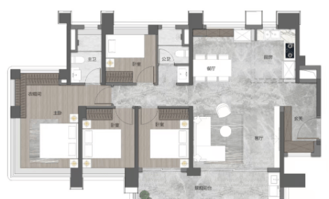 建面约95㎡三房两卫:南向三房设计,客餐厅和阳台开间达到5.6米,主卧套房设计,带270°大飘窗。