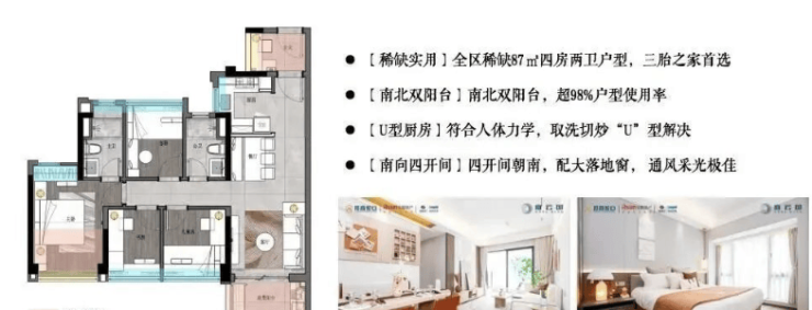 89㎡四房两卫:南向11米采光面,LDKG一体化设计,次卧面积达14㎡,超越周边楼盘主卧尺度。