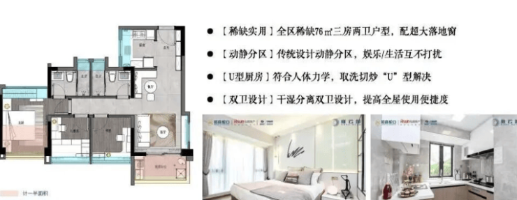 78㎡三房两卫:四开间朝阳,得房率高达105%,主卧套房设计,空间感媲美市面100㎡产品。