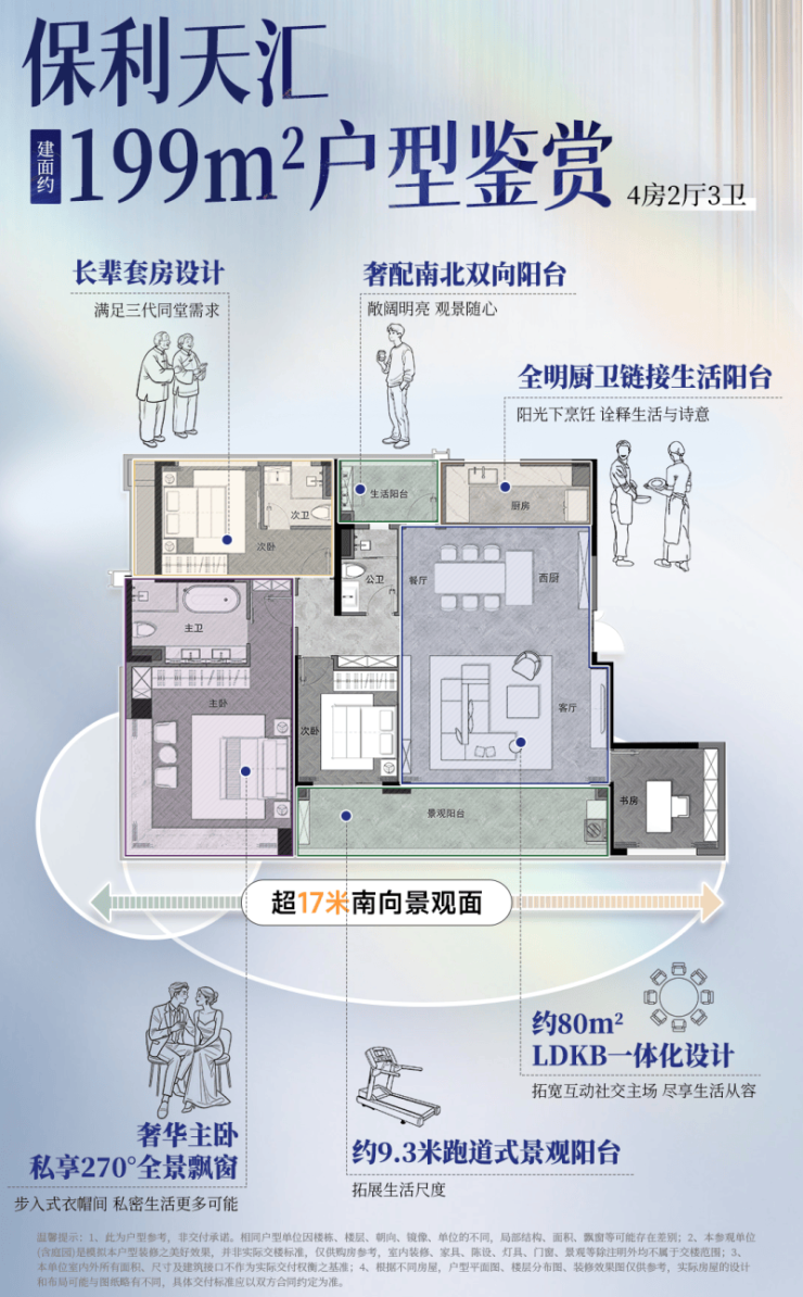 本次加推的199㎡户型,堪称保利“天系”产品力的集大成者。仅占全盘3%的稀缺比例,29席压轴登场,注定成为收藏级资产。其最大亮点在于约80㎡的LDKB一体化超级双厅——客厅、餐厅、厨房与观景阳台完全打通,形成超尺度家庭互动空间,无论是三代同堂聚餐,还是朋友聚会派对,都游刃有余。双套房设计更是直击改善痛点:主卧套房约35㎡,配备独立卫浴、步入式衣帽间及270°转角飘窗,视野横跨中央园林与城市天际线;次卧套房则充分保障老人或孩子的隐私与舒适。全屋南北通透,四开间朝南,采光通风俱佳。每一寸空间都经过人性化打磨,真正实现“大而不空,奢而实用”的居住哲学。