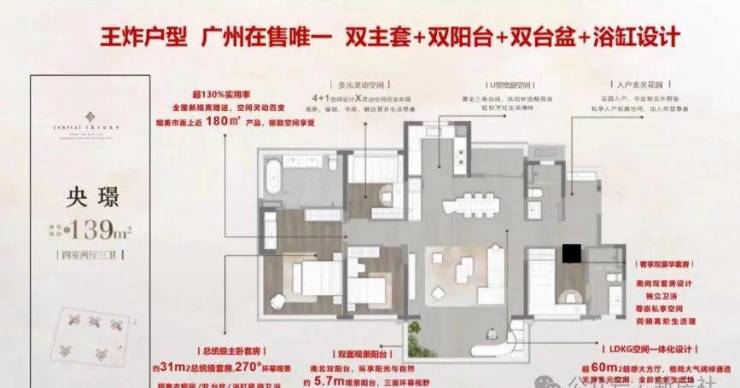 139㎡户型:南北双阳台对流+揽园林瞰珠江景,双套房设计,塔尖人群奢享。