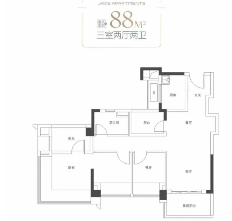 建面约 88㎡三房两厅两卫,为刚需家庭量身打造,户型方正实用,四开间朝南,全屋采光充足,通风流畅。入户预留收纳空间,厨房采用 U 型布局,操作动线合理,搭配创新收纳设计,提升空间利用率。飘窗采用可拓展设计,进一步延展室内空间,整体使用率超 100%,实得面积媲美传统大户型,以小户型面积实现大三房功能,总价友好,实用性拉满。