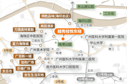 项目位于广州市海珠区的核心地段,距离晓港地铁站仅约600米,步行约8分钟即可到达。周边交通网络发达,五大主干道串联起广州市区,方便快捷地直达天河、越秀等区域。此外,项目周边还有丰富的教育资源和商业设施,包括多所优质学校和大型商场,满足居民日常生活需求。