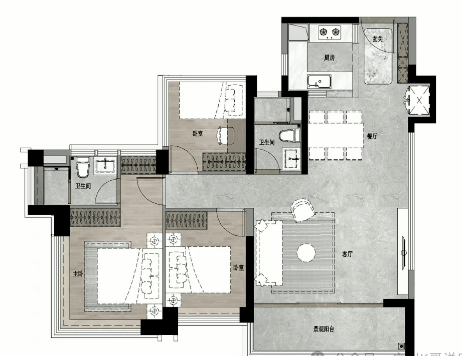 105㎡四房两厅两卫:五开间朝南,全屋南北对流,开放式厨房与餐桌互动,增加了家庭成员间的互动性。