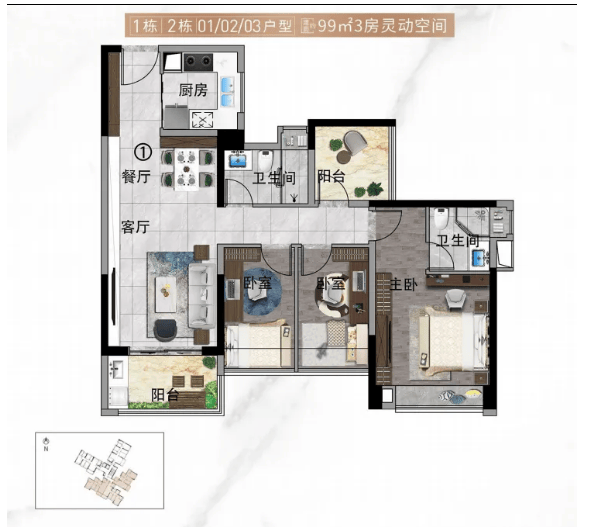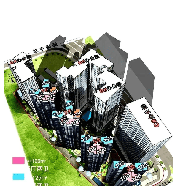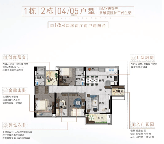 住宅户型:住宅仅有 550 套,1、2 栋 32 层,3、4 栋 31 层。户型主要有 99㎡ 3 室 2 厅 2 卫和 125㎡ 4 室 2 厅 2 卫两种。99㎡户型户户朝南,竖厅格局动静分区,双阳台设计提升生活品质,还有灵动空间满足二孩家庭个性化需求。125㎡户型多开间朝南,有入户花园,满足三孩家庭个性化进阶需求,创意阳台与全能主卧带来精致生活体验。且整个小区无朝北户型,4 栋点状式楼栋布局保证每户充足观景视野。