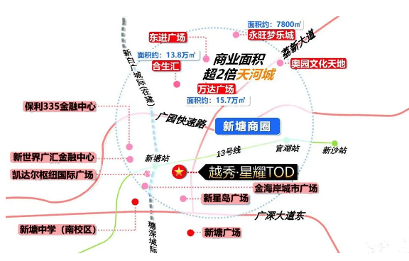 交通枢纽:紧邻新塘 TOD 交通枢纽中心,直线距离仅 400 米,交通便捷程度极高。