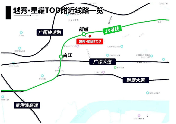 项目距离地铁 13 号线新塘站仅 400 米,新塘站作为东部最大的交通 TOD,含金量极高。它集合了 5 地铁 + 3 高铁 + 2 城轨,线路大多直连城市核心地带。其中,13 号线二期工程进度已完成 84%,建成后从项目出发无需换乘直达珠江新城;28 号线(规划中)串联佛山千灯湖 CBD、荔湾白鹅潭 CBD 等多个区域;穗莞深城轨直通深圳机场、前海 CBD;新白广城轨(建设中)连接新塘与广州白云国际机场。新塘 TOD 枢纽盘活了大湾区核心城市的人口与资源流动,未来发展潜力巨大,犹如香港西九龙 TOD 般充满想象。