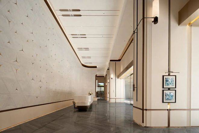 园林走“都市谧境”路线,参考新加坡城市花园风格,整个方案打磨了半年,每棵树包括罗汉松都有专属挑选方案,树形、枝叶反复精选,最长耗时半年,景观层次丰富,随手出片。归家动线设计得像超五星酒店,主入口有3米高罗汉松迎宾,下沉式落客区用Prada绿大理石做40米长背景墙,参考罗马万神庙造型,气场直接拉满。大堂挑高8米,整面皇家白玉奢石墙,透光镂空雕刻加隐藏灯带,呈现“星辉漫墙”效果,奢华又有艺术感。