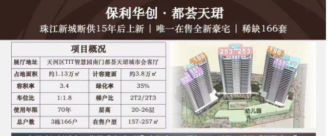 保利华创·都荟天珺是珠江新城东片区难得一见的新盘,属于保利“天”字系的顶配产品,定位纯粹豪宅,整体体量小而精致,全盘只有166户,全部是大平层设计,主推157到257平区间,客群圈层天然高端。