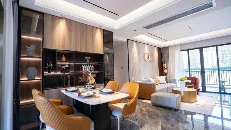 户型采用大横厅设计,客厅和餐厅连通在一起,形成了超大的公共活动空间,既提升了空间的通透感,也为家庭互动提供了充足的空间,日常家人聚餐、朋友聚会,都非常宽敞。