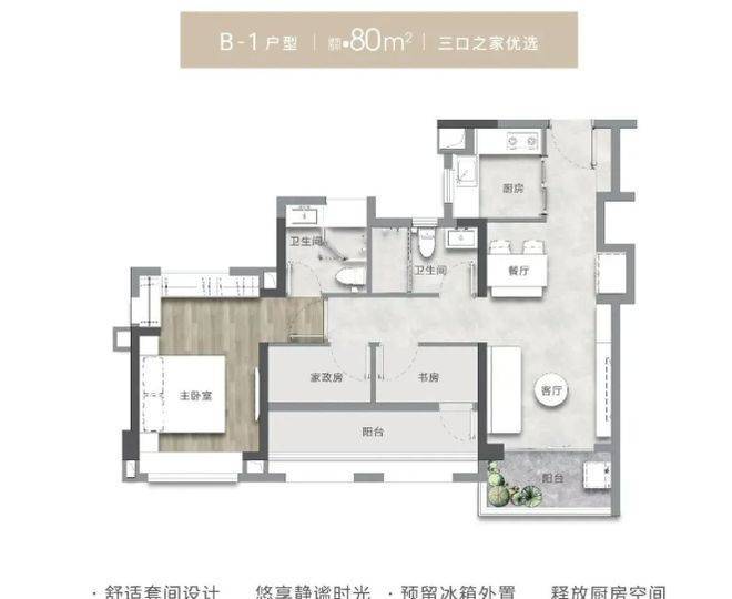 项目的户型设计注重实用性与舒适性的结合,得房率高达 95%,在同等建筑面积的情况下,相比其他楼盘多出两个空间,为居民提供了更为宽敞的居住体验。部分户型设计充分考虑家庭结构的多样性,例如 89㎡四房户型,合理的空间布局能够满足三代同堂家庭的居住需求。每个房间的尺度适宜,功能分区明确,动静分离,确保家庭成员的生活互不干扰,同时又能在公共空间享受温馨的家庭时光。这种实用的户型设计,既满足了当下家庭对居住空间的需求,又具有一定的前瞻性,适应家庭结构的变化,为居民打造舒适、便捷的居住环境。
