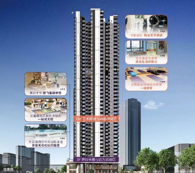 社区内部通过三层架空空间设计形成丰富的生活及休闲区域:三楼空中泳池、艺术书吧、童话乐园及运动天地;14楼设有瑜伽区、休闲漫步区、棋弈区及赛车区,为居民提供全龄段休闲活动场所。园林景观方面,社区采用立体园林布局,包括前庭广场、生活花园及归家礼序等多功能景观空间,实现舒适宜居的归家体验。