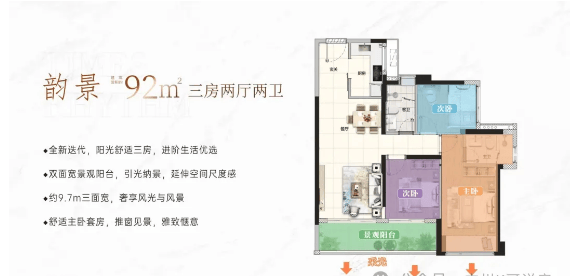 该户型为改善型主力产品,位于 3 栋高楼层,带装修总价约 350 万起。户型采用双阳台设计,一个用于观景休闲,一个用于生活晾晒,功能分区明确;主卧带独立卫浴和步入式衣帽间,私密性强,舒适度高,能够满足业主的高品质居住需求。