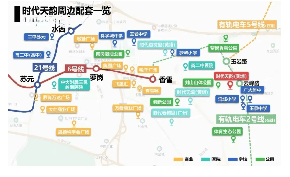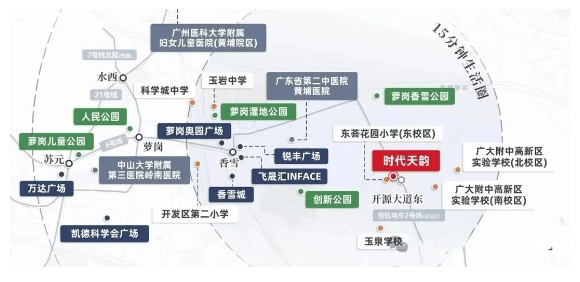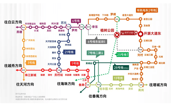 对于依赖地铁出行的业主而言,虽然项目距离最近的地铁香雪站约 3.8 公里,但通过有轨电车接驳的方式,能够高效解决地铁通勤问题。此外,规划中的 6 号线东延段和 23 号线将在附近的植树公园站交汇,未来轨道交通网络将进一步完善,出行便利性将大幅提升。同时,项目周边的开源大道等交通主干道四通八达,自驾出行也十分便捷,能够快速连接广州各区域。