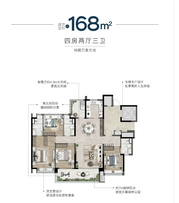 项目主力户型为建面约105-168㎡的四至五房,全部采用两梯两户或两梯三户设计,梯户比极低,有效避免高峰期等梯尴尬。得益于2.0的低容积率,户型得房率高、公摊小,空间实用性强。楼栋采用“边缘围合式”布局,不仅减少楼栋数量,更最大化中央园林视野,约200米楼间距确保每户采光与景观无遮挡。值得一提的是,除7号楼为人才房外,其余楼栋均为可售商品房。对于追求居住私密性、舒适度与家庭成长空间的改善客群而言,这种“低密+大户型+低梯户比”的组合,在同价位产品中极具稀缺性。