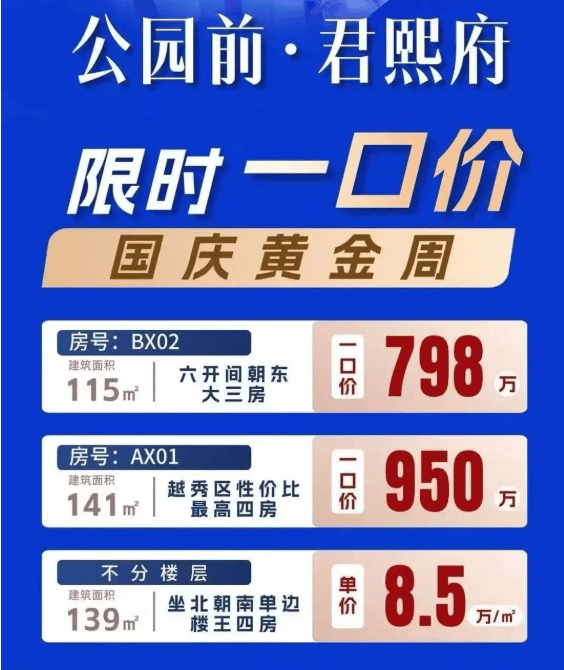 公园前·君熙府目前推出了国庆黄金周大放价活动,具体价格如下: