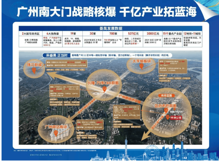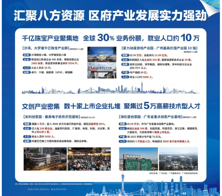 板块:【中洲公馆】坐落于番禺区府中心板块,这里是广州新经济中轴串联广州历史文化经济核心的重要节点。该区域连接珠江新城CBD、长隆万博中心,南段延伸至市桥中心,致力于打造世界级城市会客厅。作为全区人口密度最集中的区域,5公里范围内汇聚了80万常住人口,是外来人口流入的主阵地。政府重点打造文旅深度融合发展,以市桥渔帆主题规划为核心,国家3A景区西坊大院文创园旅游地标崛起,承接新中轴文脉的传承与创新,未来发展潜力空间巨大。板块内名企集结,百度、阿里巴巴等500强企业抢驻市桥,形成了强大的产业核聚效应,为区域带来了源源不断的经济活力和人才红利。