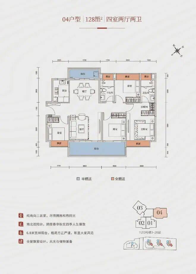 128㎡四房:主卧带独立卫浴与瞰景飘窗,餐客一体,动静分区清晰。