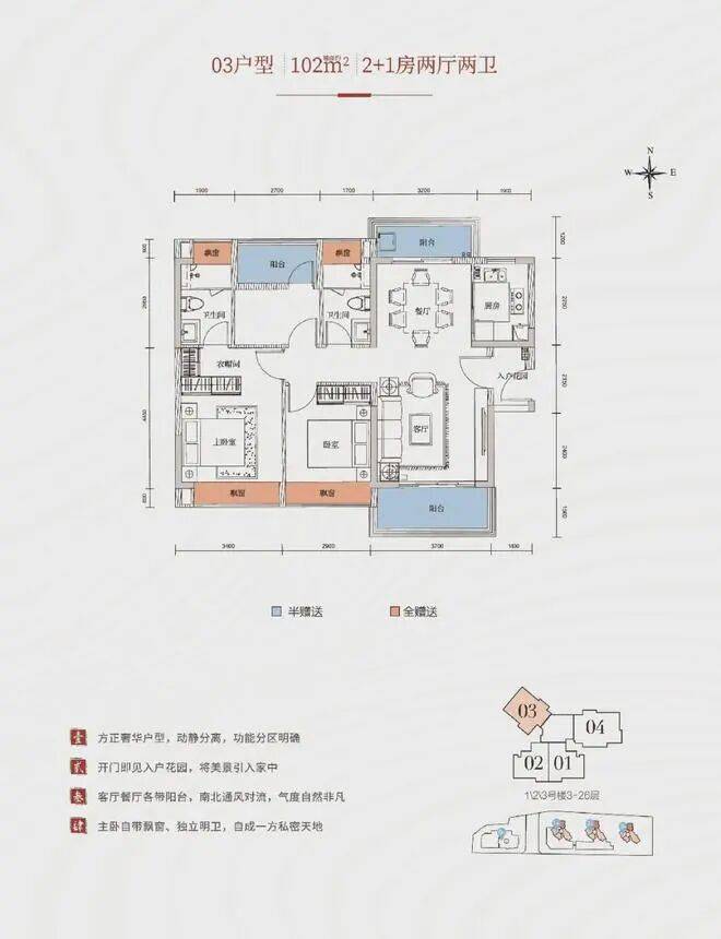 98–115㎡三至四房:三室朝南、大横厅连接超大景观阳台,视野开阔;