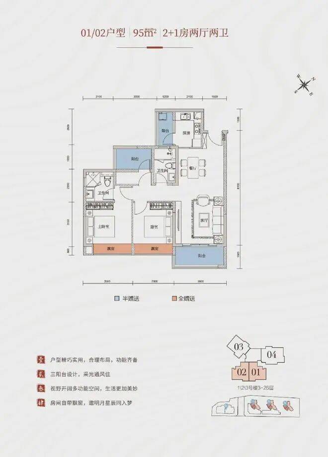 95㎡三房:紧凑高效,赠送空间可改造为多功能房,适合年轻家庭;