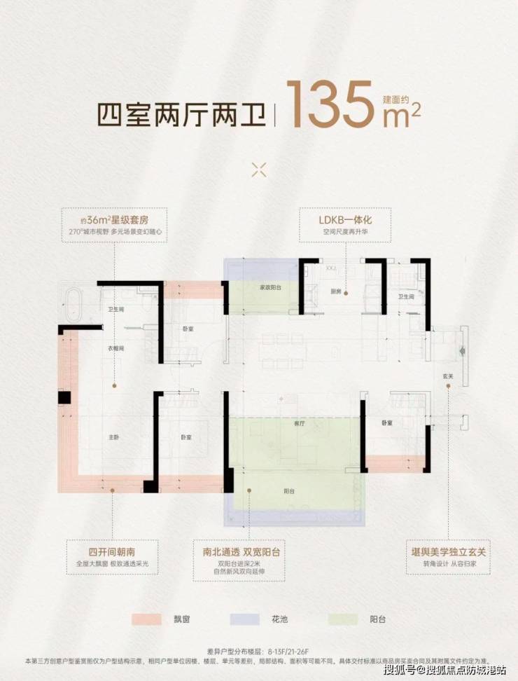 135㎡四房两厅双阳台:南北通透设计,客厅开间约5.25米,阳台开间约5.45米,主卧开间3.6米,大家庭的“改善优选”。