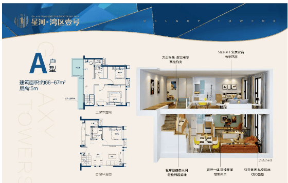 以 1 栋产品为例,约 39 - 60㎡的二至四房户型,5 米层高 LOFT 设计,实现买一层得两层。空间布局精巧,玻璃护栏与扶手搭配让空间更显明亮大气。收纳组合系统高效利用空间,配备多种收纳柜满足生活所需。全屋人性化设计,充分考量国人使用习惯,如马桶旁预留插头方便拓展智能马桶等。