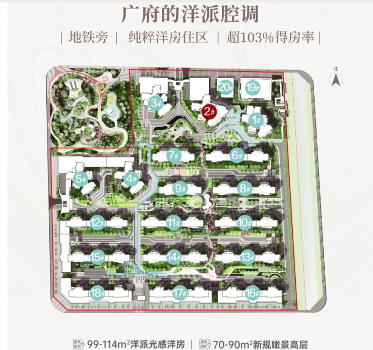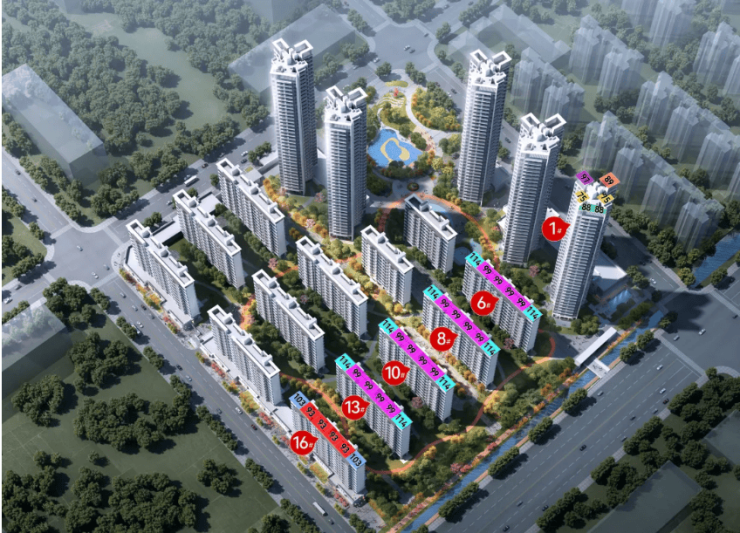 项目采用 **“南低北高、板式错落”** 的科学规划布局,13 栋低层板式洋房排布于社区南侧,5 栋高层塔楼排布于北侧,最大化保证每一栋建筑的采光、通风与景观视野,避免楼栋遮挡,实现户户有景、全南向采光的居住体验旭辉集团。