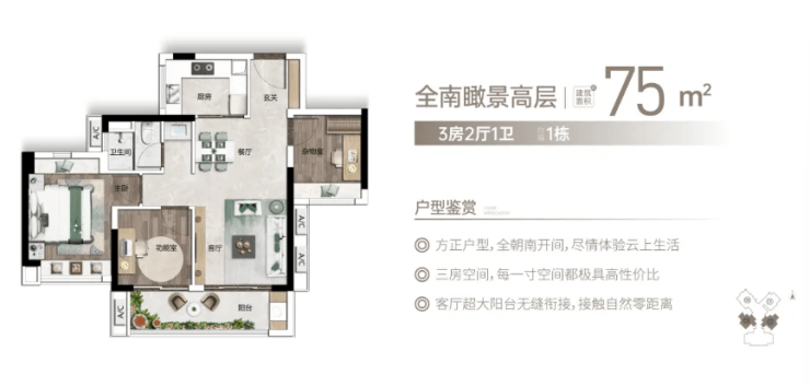 75㎡三房两厅一卫:经典刚需三房设计,全南向采光,户型方正无浪费;客餐厅一体化连接南向阳台,空间开阔通透;三间卧室均带飘窗,拓展使用空间;厨房 L 型设计,操作流畅;卫生间干湿分离,实用性拉满,适合新婚夫妻、三口之家,总价可控、性价比极高。
